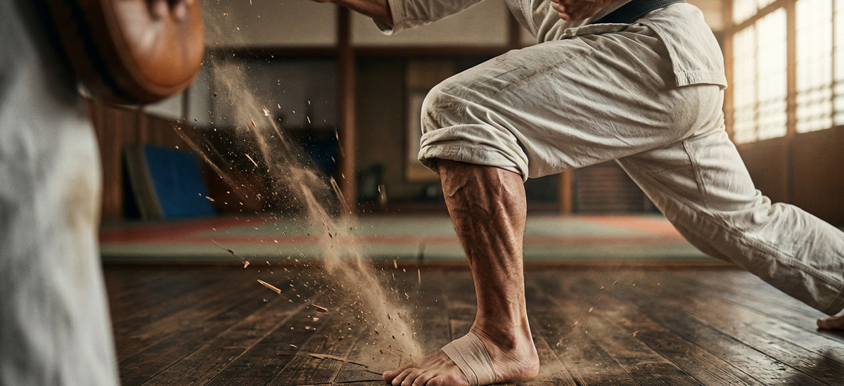 Mistrovské ovládnutí této síly od cvičence vyžaduje obrovské a neustálé uvědomění si svých chodidel, nohou, boků a středu těla. Vyžaduje mikrosekundově přesné načasování, dokonalé skládání kloubů, synchronizovaný dech a permanentní nervomotorický trénink. Reakční síla podložky je tím magickým rozhraním mezi samotným tělem a naší planetou. Je to bod, kde se čistá fyzika potkává s lidskou biologií a kde se veškerý potenciál mění na explozivní, ničivou akci. Když tento princip jednou provždy pochopíte a podmaníte si jej, váš pohyb už nikdy nebude pouhým bezcílným mácháním končetin; promění se v úmyslné, metodicky doručované a drtivé údery. Definitivně si tak potvrdíte nezvratný fakt, že v bojové mechanice podlaha nikdy neplnila funkci pouhého pasivního koberce, na kterém stojíte. Byla, je a navždy zůstane vaším prvním a nejmocnějším zdrojem síly.